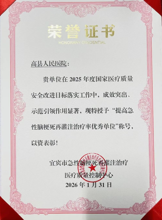 来源: 时间:2026-02-04 09:28:00 近日,宜宾市急性脑梗死再灌注治疗医疗质量控制中心公布2025年度专项评价结果,我院获评为 “提高急性脑梗死再灌注治疗率优秀单位”。