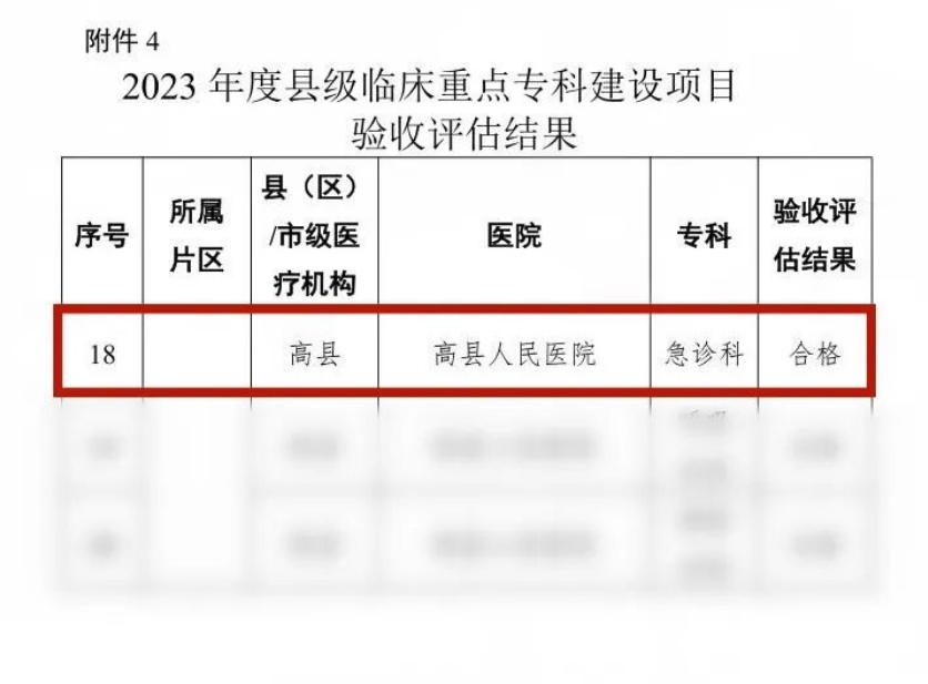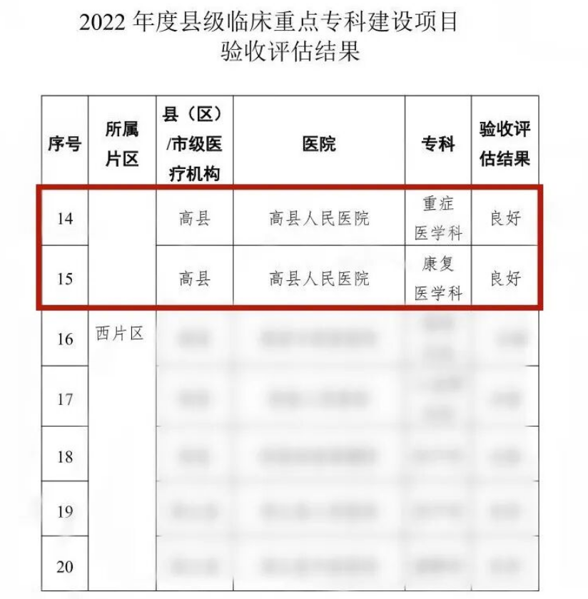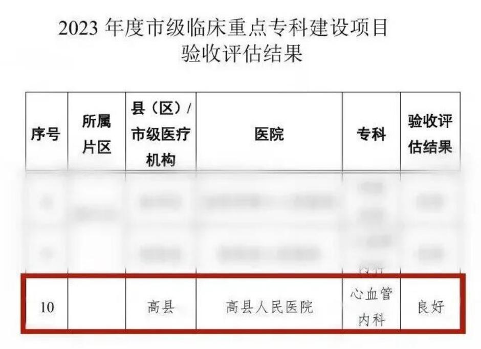 来源: 时间:2026-02-11 09:49:00 近日,宜宾市卫生健康委员会公布2022—2023年度临床重点专科建设项目期末验收评估结果,高县人民医院市级临床重点专科心血管内科、县级临床重点专科重症医学科、急诊科、康复医学科成功通过市、县级临床重点专科验收,标志着我院学科建设与综合服务能力迈上新台阶。