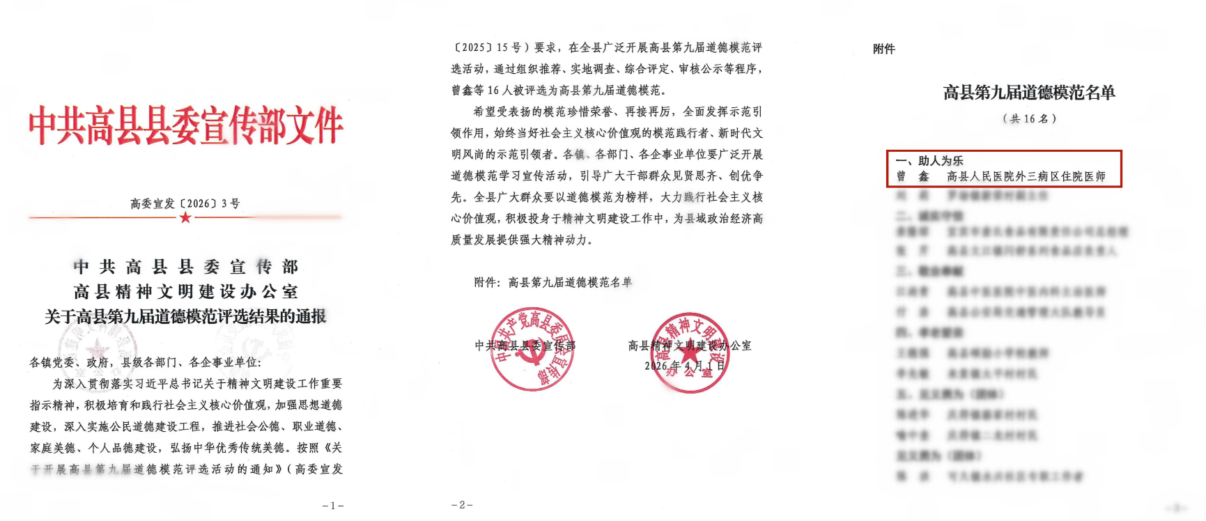 来源: 时间:2026-04-10 09:11:07 近日,中共高县县委宣传部 高县精神文明建设办公室发文《关于高县第九届道德模范评选结果的通报》,高县人民医院外三病区医师曾鑫同志被授予“乐于助人”道德模范荣誉称号。作为一名青年医务工作者,曾鑫同志在日常工作和生活中,以实际行动展现了当代医者的责任与担当。