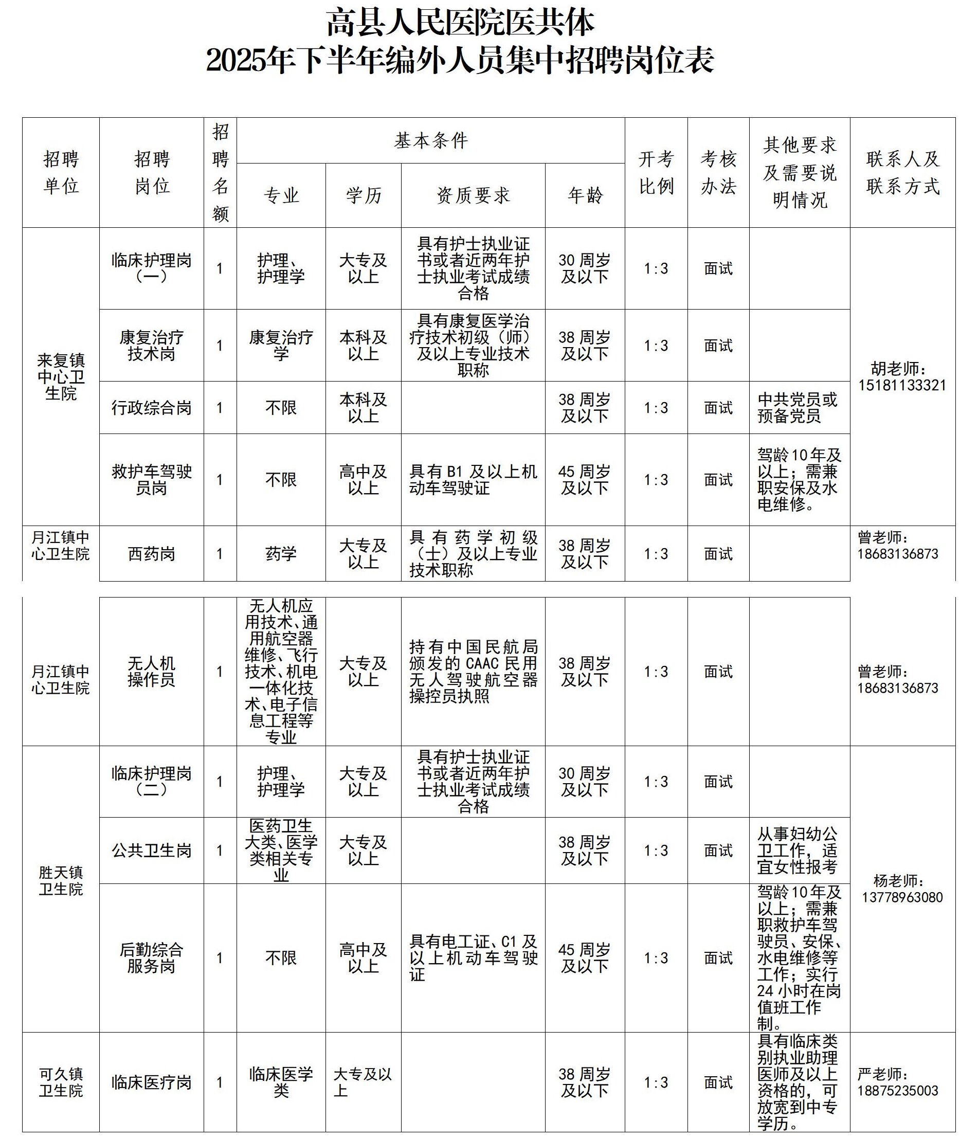 详见《高县人民医院医共体2025年下半年编外人员集中招聘岗位表》(附件1)。