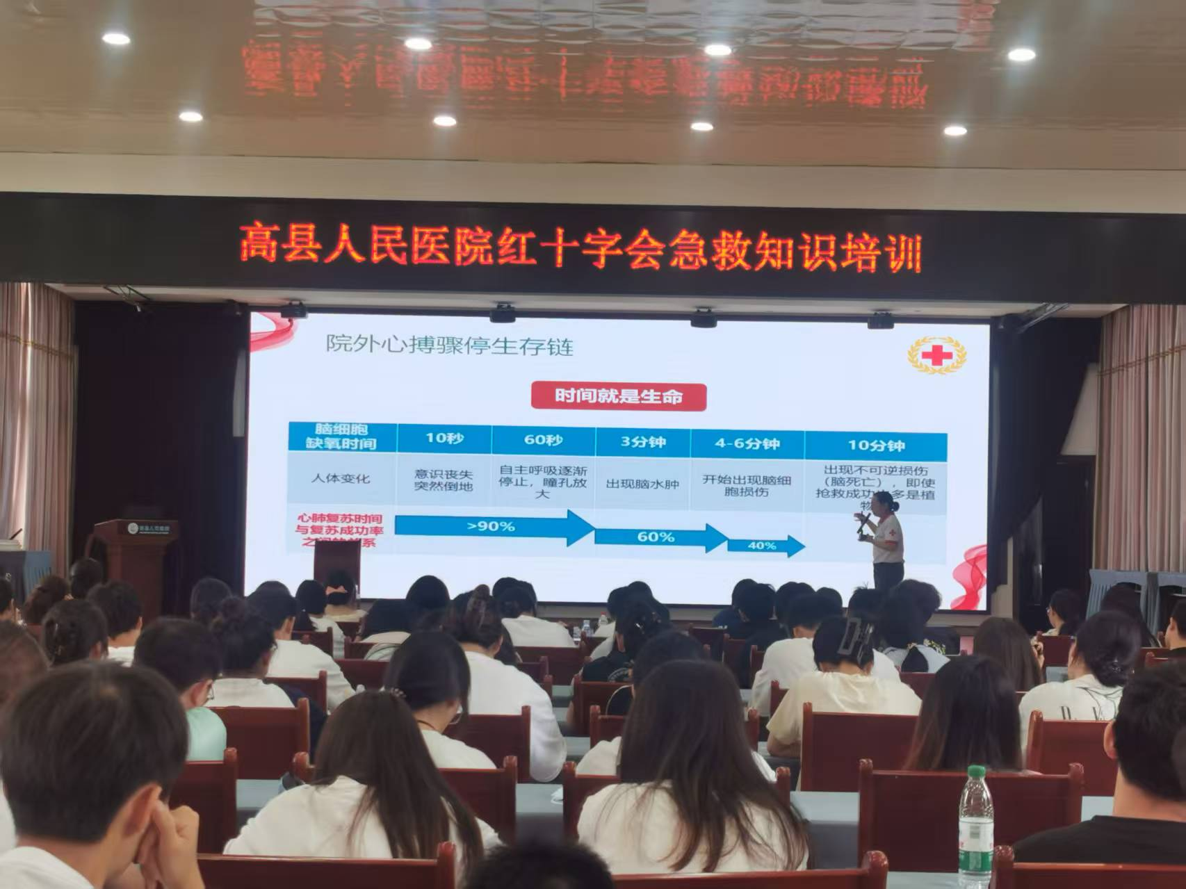 来源: 时间:2025-07-18 17:21:00 为深入弘扬"人道、博爱、奉献"的红十字精神,切实提升实习生的应急救护能力,7月18日上午,高县人民医院成功举办实习生红十字急救知识专题培训。本次培训由中国红十字会二级培训师、高县人民医院红十字会秘书长兼公共卫生科科长何夕艳担任主讲。