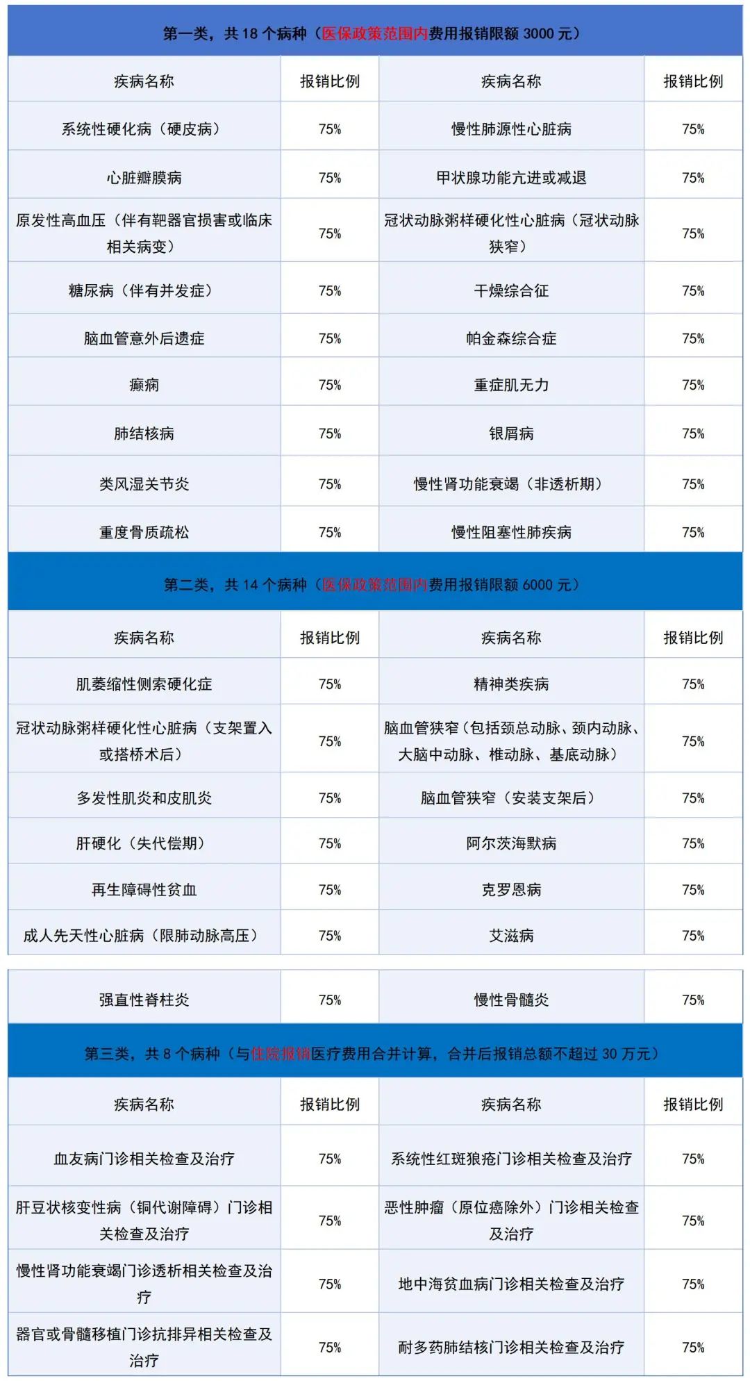 3)第一类、第二类病种报销限额为所认定病种中待遇最高的一个病种限额,每增加一个病种,报销限额增加100元。第三类门诊特殊疾病报销限额单独计算。