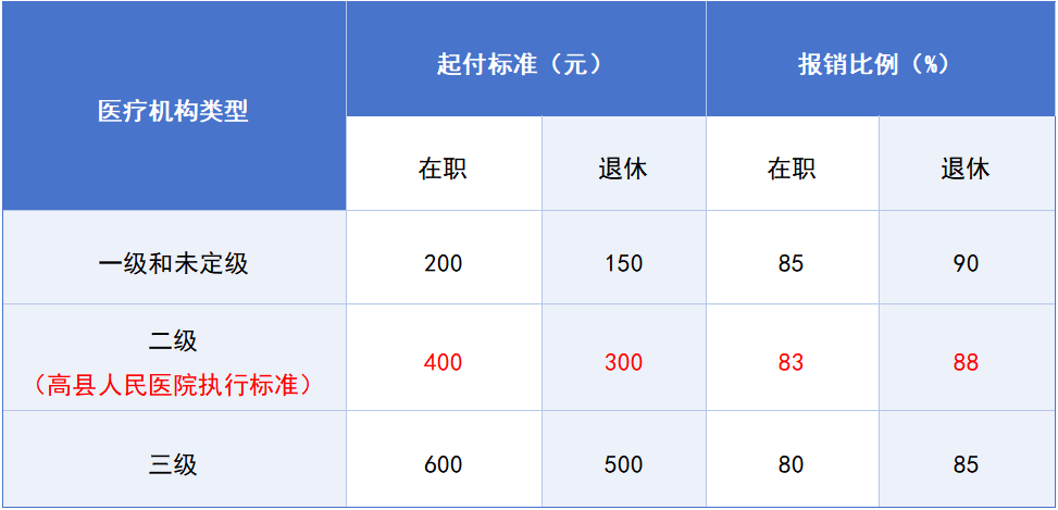答:参保人员分在职和退休,按照就医医疗机构级别实行不同的起付标准和报销比例,报销费用必须是医保政策范围内费用。起付标准、报销比例如下: