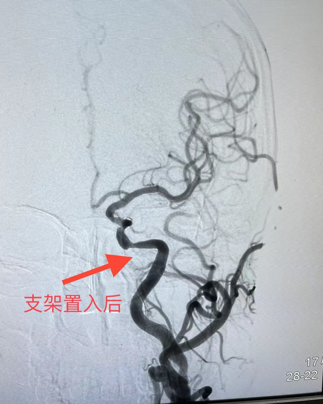 1月10日,罗厚红副主任医师在上级医院专家指导下行经皮左侧颈内动脉球囊扩张及支架置入术。术后复查造影,狭窄的血管管径增大,血流满意,整个手术过程约1小时,术后患者麻醉复苏较快,第二天就可下床活动,患者及其家属均对于治疗满意。