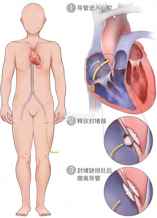 不用开刀,不会在体表留下疤痕,只需通过穿刺右侧股静脉插入一根宽几毫米的导管,将封堵器送至缺损部位释放,先天性房间隔缺损就得到了根治。