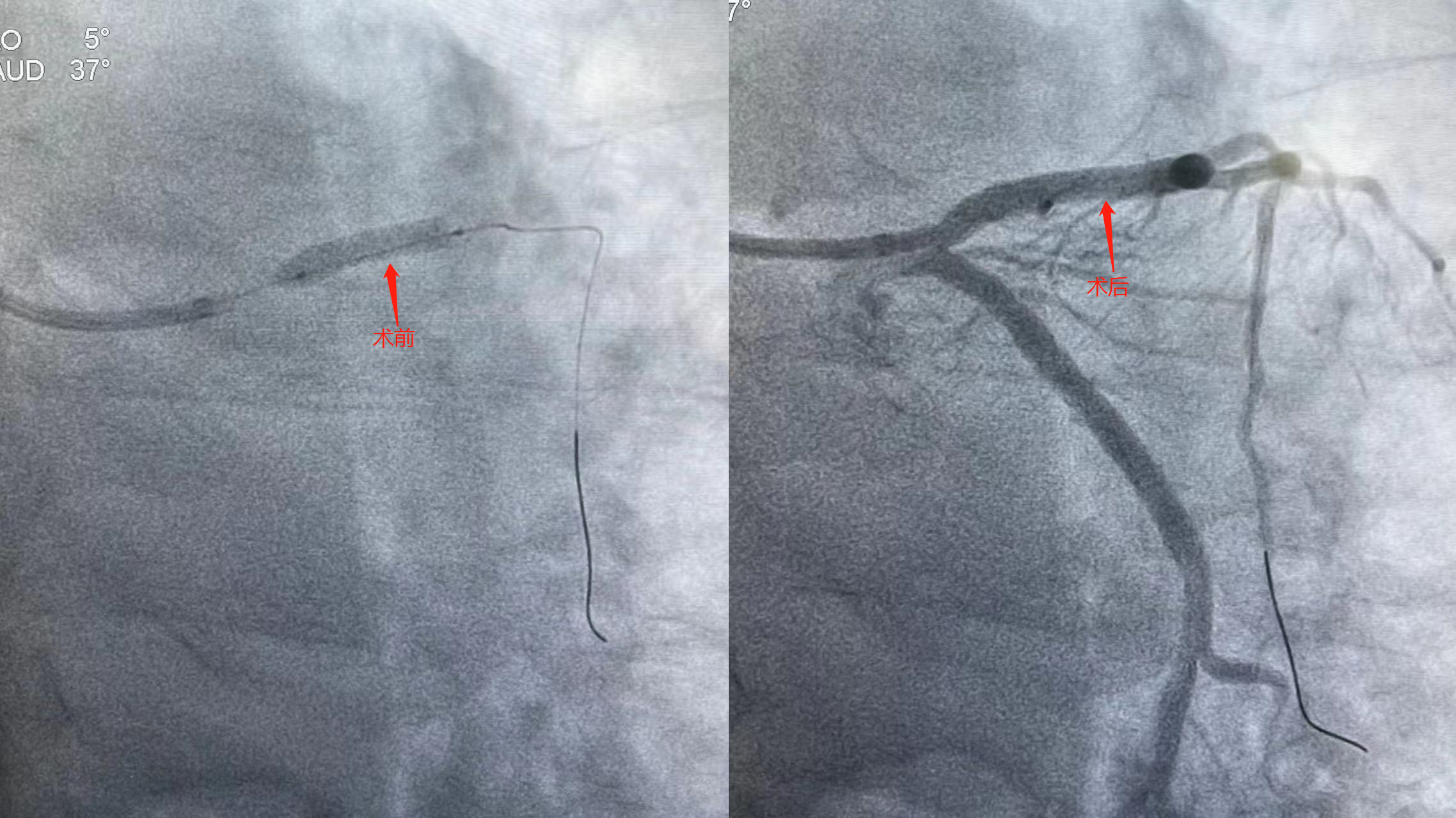 DSA术后造影前降支支架扩张满意,血流恢复,症状缓解。术前、术中、术后食道超声评估封堵器释放位置完美,未见残余分流。目前心脏恢复良好,复查指标正常,已出院。