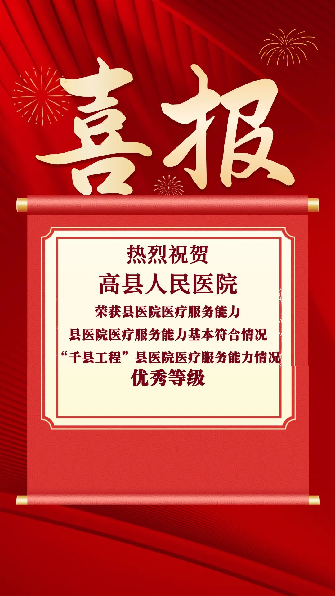 近日,四川省卫生健康委员会发布了《关于2024年度四川省县医院医疗服务能力评估情况的通报》,高县人民医院在“医疗服务能力标准基本标准符合情况”、“县医院医疗服务能力推荐标准符合情况”、“‘千县工程’县医院医疗服务能力情况”三大核心维度均获评“优秀等级”。