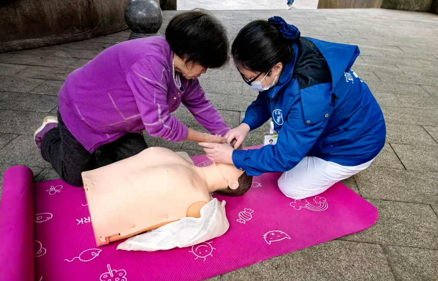 义诊现场,医护人员通过“人体模型”现场演示心肺复苏具体操作流程,耐心指导群众参与胸外按压和人工呼吸。