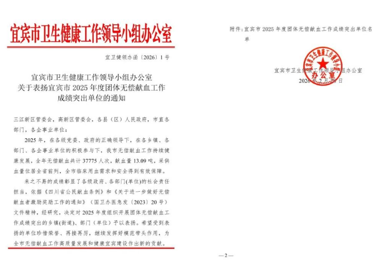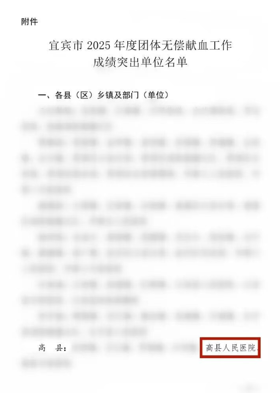 来源: 时间:2026-03-06 15:30:00 近日,宜宾市卫生健康工作领导小组办公室正式发布《关于表扬宜宾市2025年度团体无偿献血工作成绩突出单位的通知》,对在全市2025年度团体无偿献血工作中组织得力、贡献突出的单位予以通报表扬。高县人民医院荣获“宜宾市2025年度团体无偿献血工作成绩突出单位”称号。