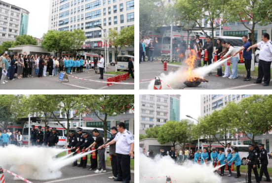 随后,在医院院坝进行了灭火实践操作。职工们按照“一提二拔三握四压”的操作要领,依次有序地使用灭火器扑灭模拟起火点。