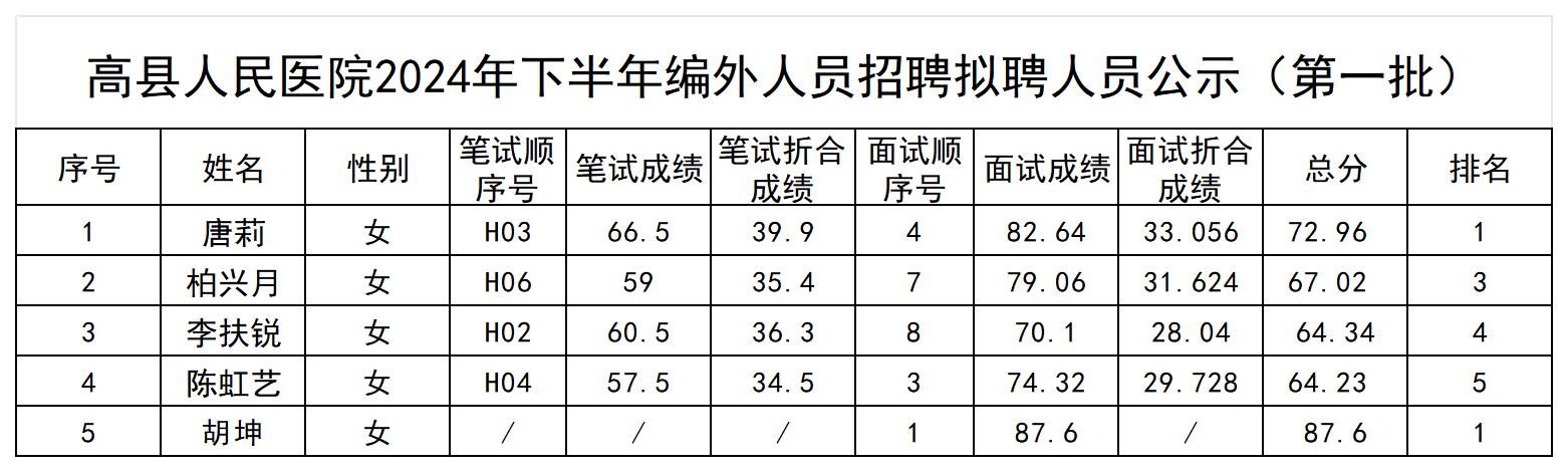 附件:高县人民医院2024年下半年编外人员招聘第一批拟聘用人员公示
