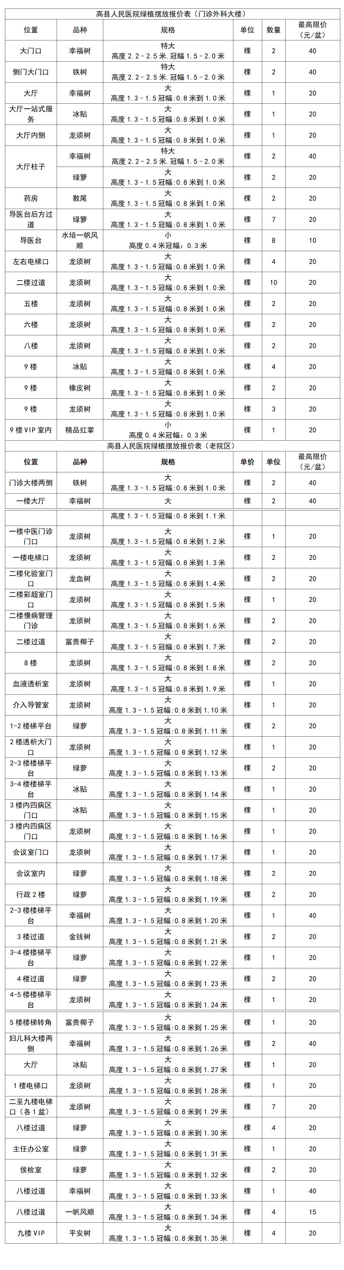 来源: 时间:2024-12-23 17:30:49 高县人民医院作为采购人,拟为我院办公区招采一家绿植盆栽租赁服务供应商。特邀请符合本次比价要求的商家参加。