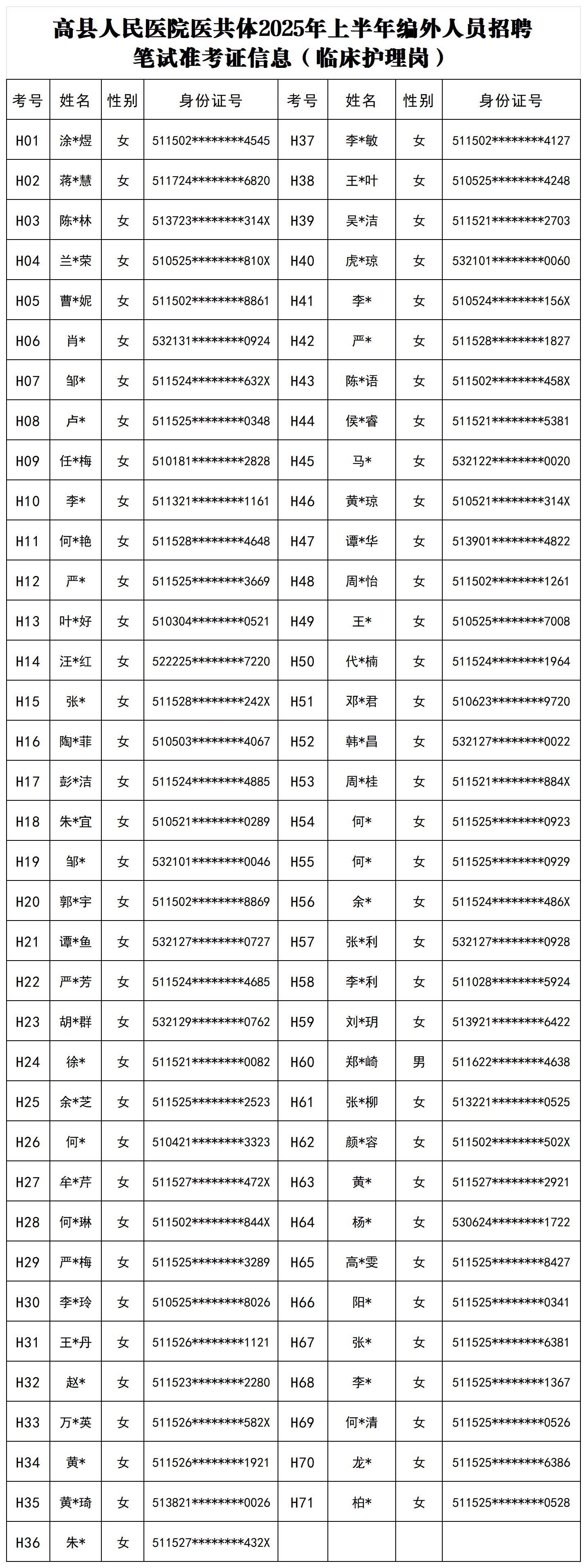 附件一:高县人民医院医共体2025年上半年编外人员招聘笔试准考证信息(临床护理岗)