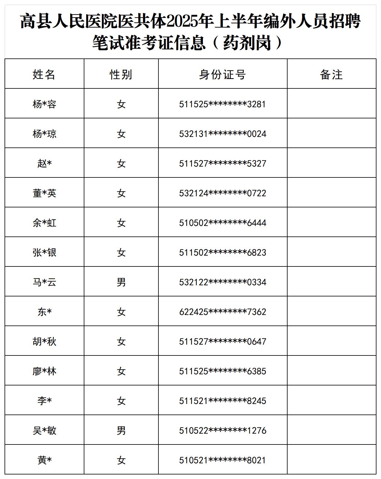 附件二:高县人民医院医共体2025年上半年编外人员招聘笔试准考证信息(药剂岗)