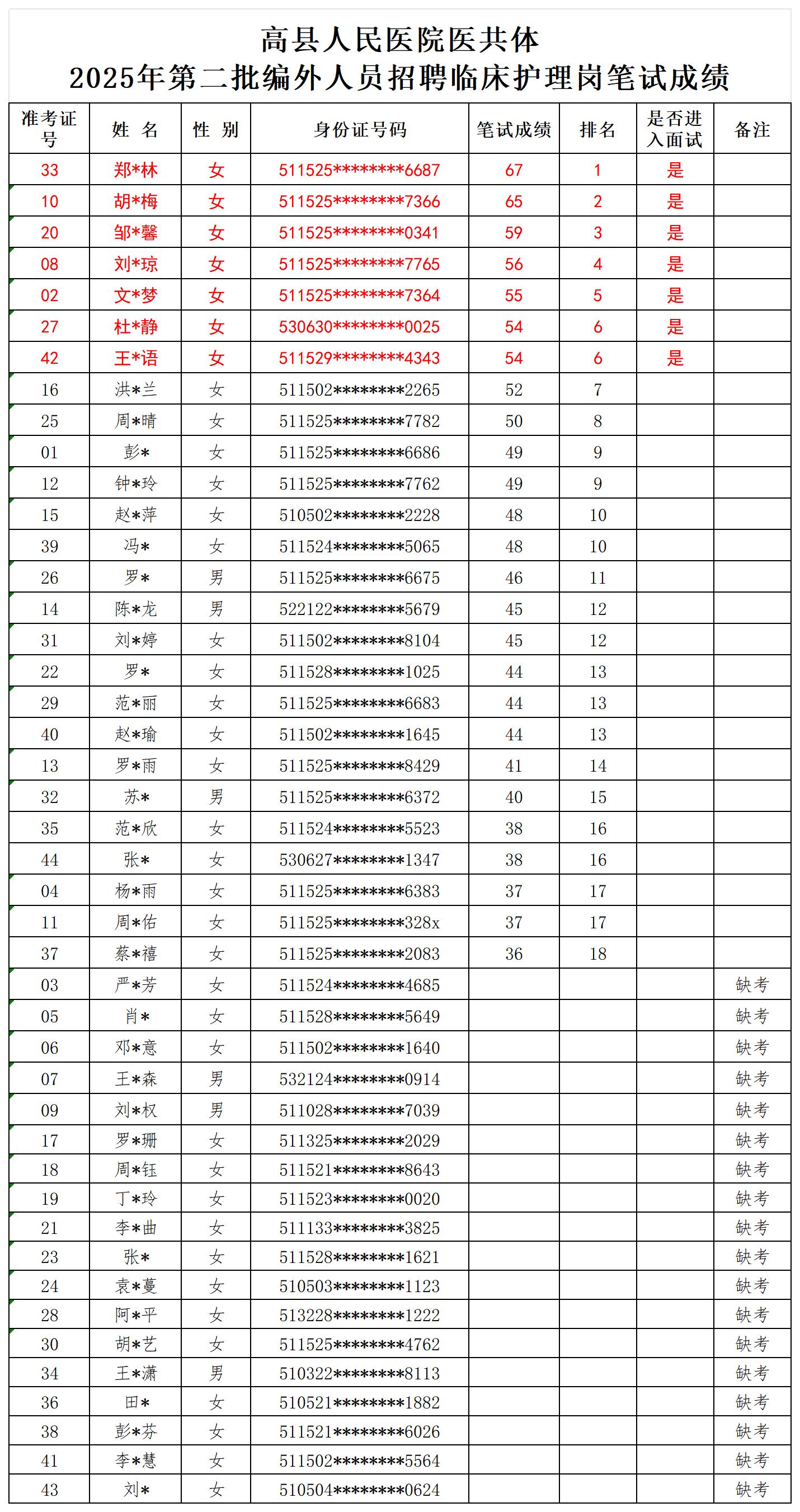 根据《高县人民医院医共体2025年上半年第二批编外人员招聘公告》的要求,现将笔试成绩和面试有关事项通知如下: