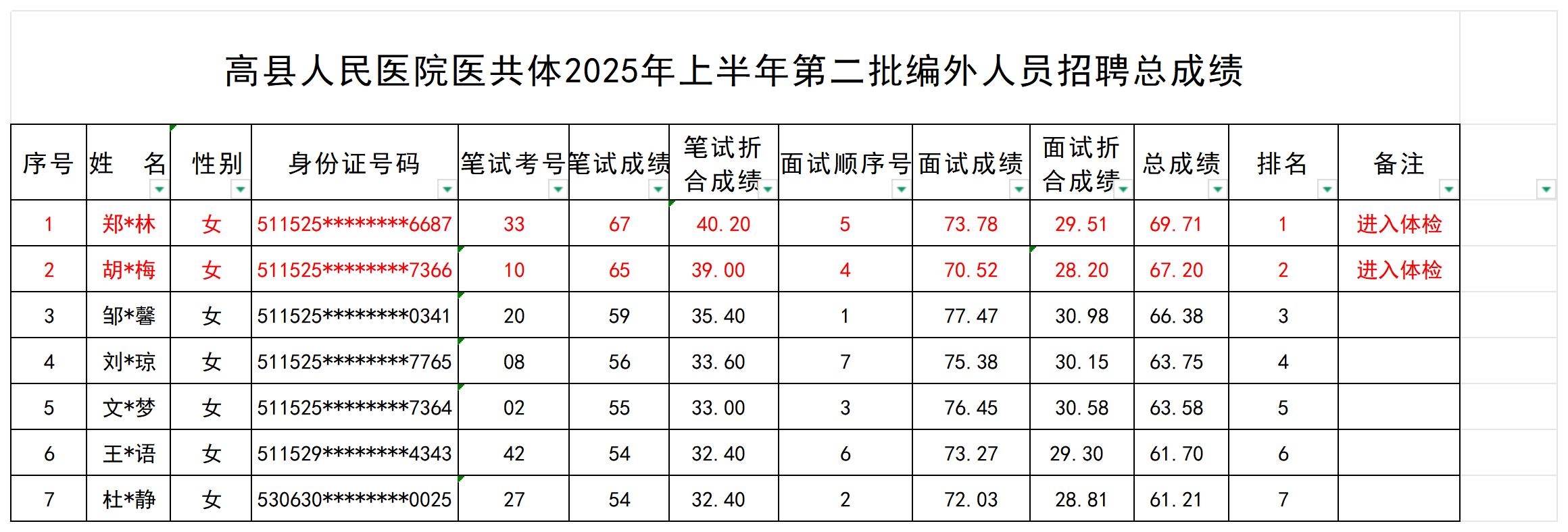 根据《高县人民医院医共体2025年上半年第二批编外人员招聘的公告》,经笔试、面试环节,现将各岗位成绩排名及进入体检人员名单公布和体检相关事宜通知如下: