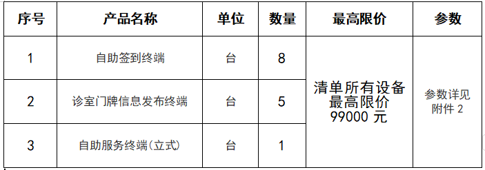 注:本次采购设备需接入医院现运行的排队叫号系统、HIS系统,报价包含接口费、运输费、安装等所有费用。