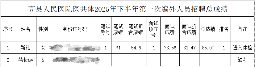 根据《高县人民医院医共体2025年下半年第一次编外人员招聘的公告》,经笔试、面试环节,现将岗位成绩排名及进入体检人员名单公布和体检相关事宜通知如下: